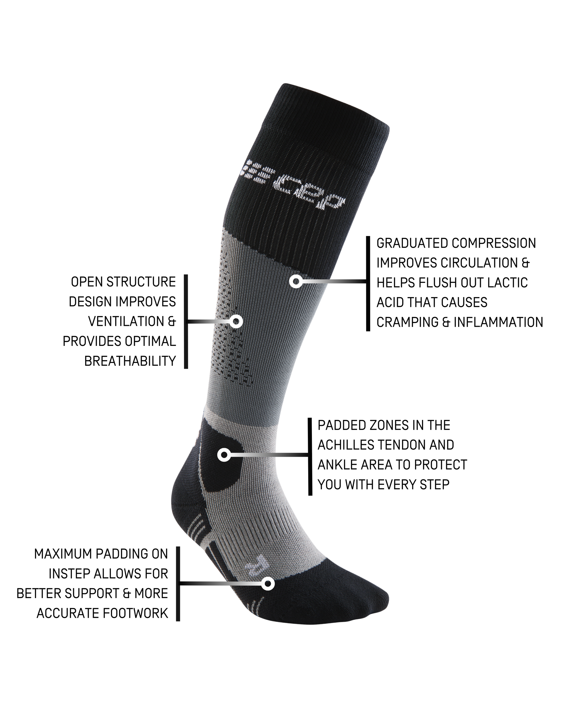 The high-cut Max Cushion Socks Hiking make hiking trips even better with two essential features: Precision padding protects feet and improves stance and stability. Airflow channels ensure ideal moisture management and keep feet fresh and comfortable. The result: maximum comfort for the next hiking adventure.