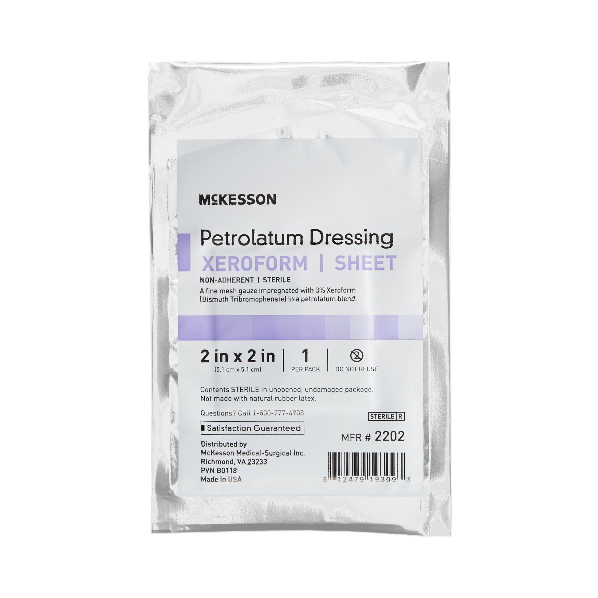 The McKesson Xeroform Petrolatum Impregnated Dressing (2 x 2 Inch) is a sterile, single-use gauze dressing designed for effective wound management. Infused with 3% Bismuth Tribromophenate, it provides bacteriostatic protection to help reduce infection risk and deodorize the wound while maintaining a moist healing environment that supports autolytic debridement.
